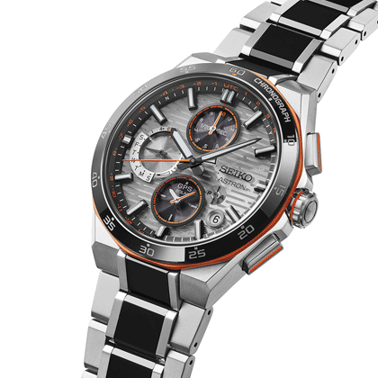Conception d’une scène nocturne vivante dans laquelle la terre est vue d’un satellite en orbite. Le boîtier et le bracelet entièrement noirs de l’édition limitée, le cadran à motif soleillé et les touches de couleur or jaune évoquent une vue de la terre la nuit, telle qu’elle est perçue par un satellite en orbite, une image qui reflète parfaitement la technologie révolutionnaire derrière l’Astron GPS Solaire.