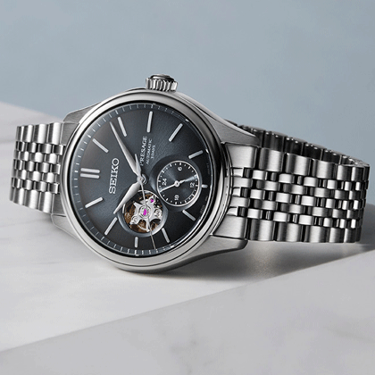 La collection Presage Classic Series accueille deux modèles inspirés du thème « Ai iro », une nuance d’indigo japonais appréciée depuis l’Antiquité et reconnue dans le monde entier. Cette couleur, considérée comme un porte-bonheur à l’époque des samouraïs, fut surnommée « Japan Blue » par les étrangers durant l’ère Meiji, lorsque les villes abondaient en tissus teints à l’Ai iro. Ce modèle se distingue également par son cœur ouvert, qui laisse apparaître le mouvement mécanique et souligne le savoir-faire horloger traditionnel.